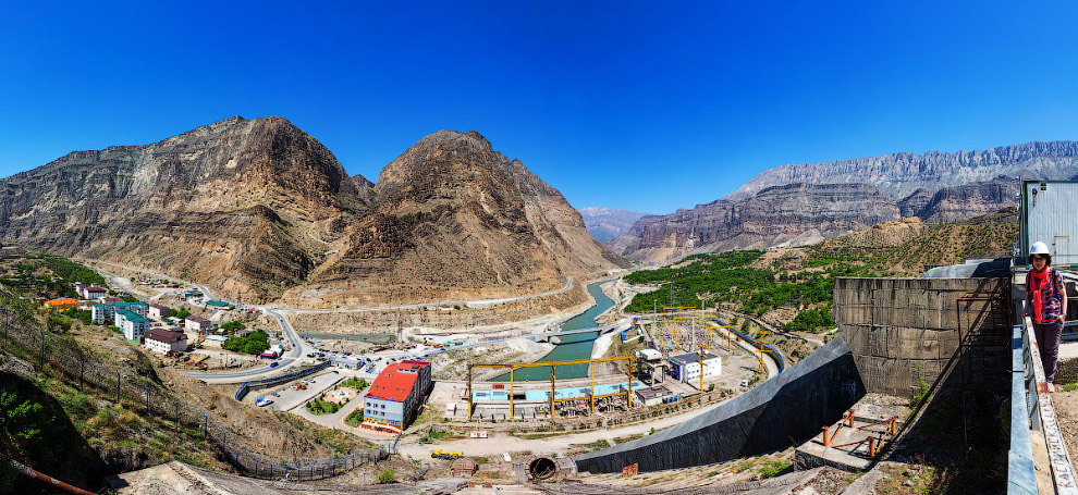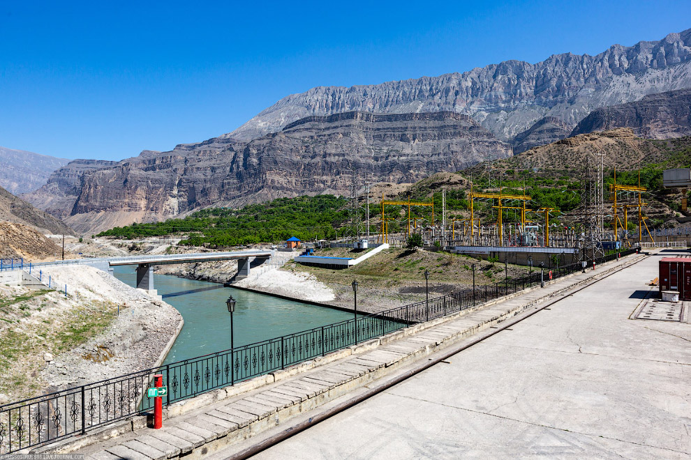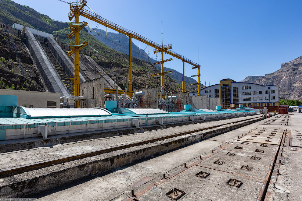 Фотография сделана с крыши машинного зала. Слева видны сталежелезобетонные турбинные водоводы. Слева двухниточные открытые водоводы длиной 190 м и диаметром 5 м каждый. Справа площадка для строительства еще двух ниток второй очереди. Сверху, на площадке смонтирована развилка на две нитки, открытая часть водовода длиной 32 метра и однониточный подземный водовод длиной 230 метров. Далее уже идет деривационный тоннель длиной 5213 м и диаметром 7,5 м, пропускной способностью 270 м3/с.