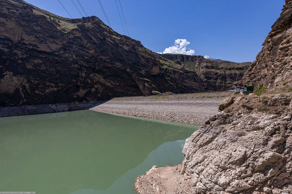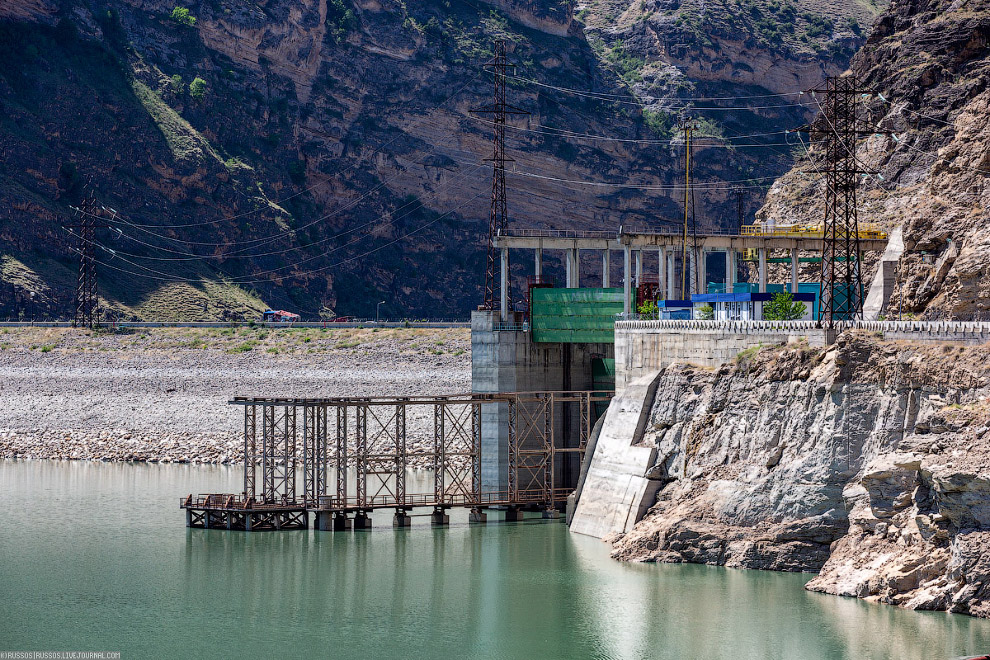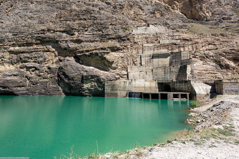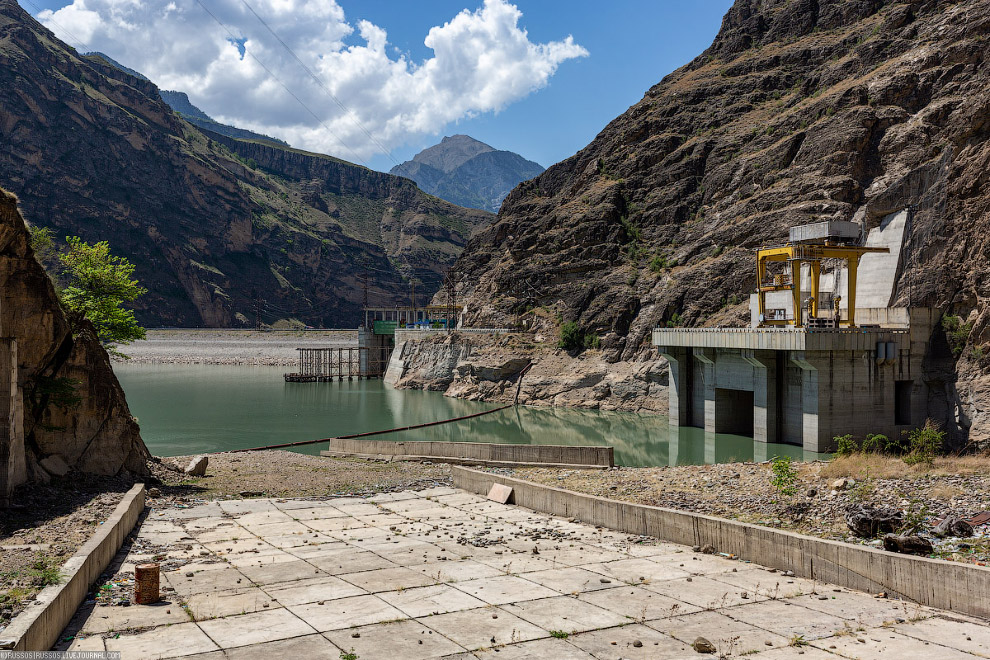 Эксплуатационный водосброс Ирганайской ГЭС. После зимы вода спущена. В Дагестане водохранилища набирают воду весной за счет таяния снега и летом, в основном, за счет осадков . А зимой срабатывают накопленную воду.