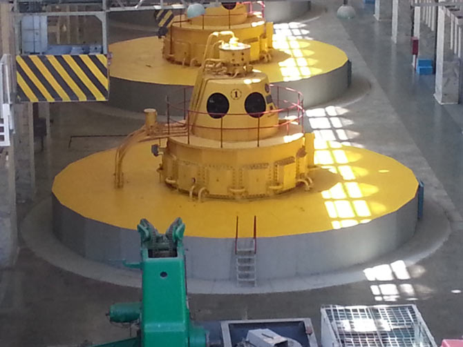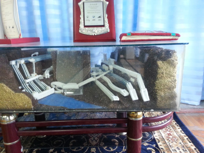 Макет всего комплекса гидроузла в помещении, где расположен пульт управления. Вода к агрегатам подаётся по трём подводящим напорным туннелям длиной от 395 до 450 метров и диаметром 10 метров. Эти туннели заканчиваются коллекторами, от которых отходят по три напорных водовода диаметром 6 метров каждый и длиной от 610 до 666 метров.