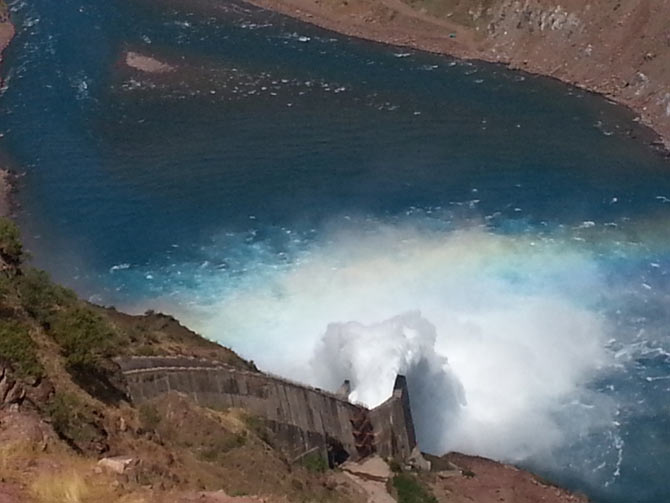 Вид на плотину со смотровой площадки. Высота плотины составляет 300 метра, что делает её самой высокой плотиной в мире. Площадь зеркала водохранилища 98 квадратных километров, объём - 10,5 кубических километров, длина - около 70 км.