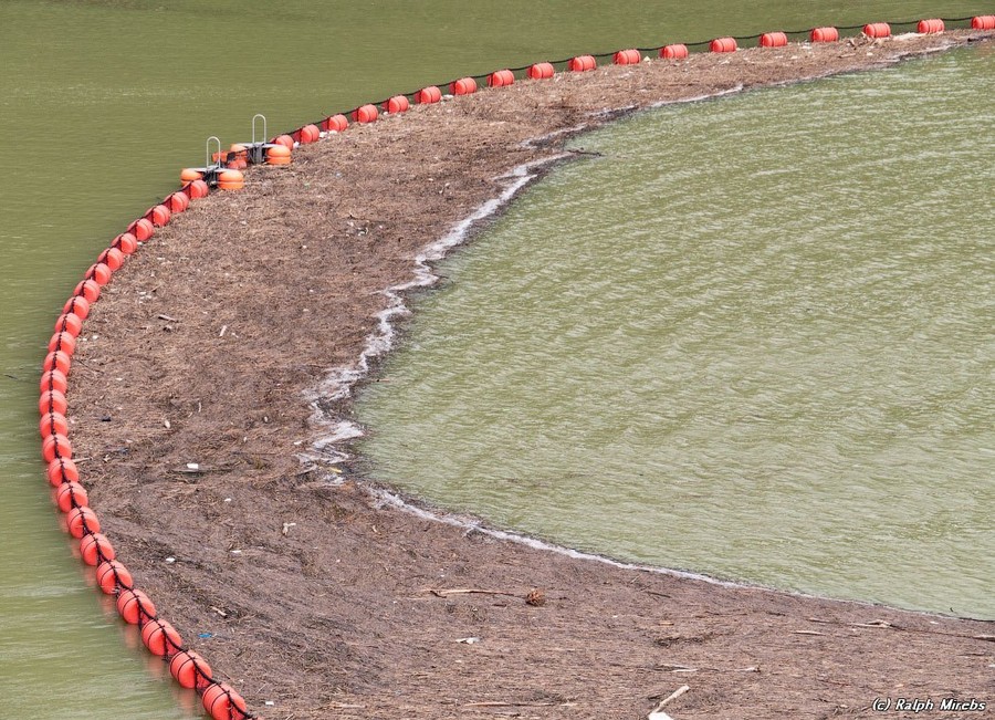 Вид со стороны водохранилища. Красная нить из поплавков задерживает плывущий мусор.