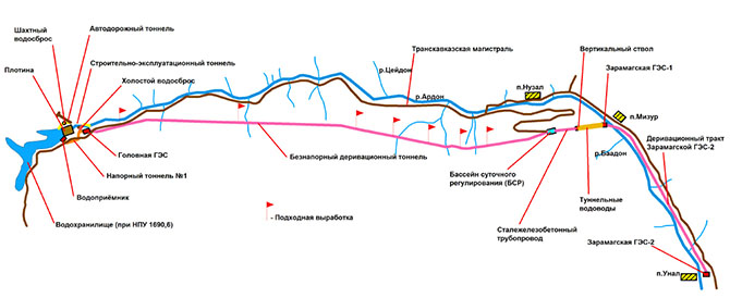 Уникальность каскада Зарамагских ГЭС состоит в том, что река Ардон на протяжении 16 километров после выхода из Туальской котловины создает перепад высот более 700 метров. Это идеальные условия для каскада станций по деривационной схеме – Головной и ГЭС-1. Первая предназначена для использования созданного плотиной напора воды, гашения его и подачи воды в безнапорный деривационный тоннель. Далее вода из бассейна суточного регулирования будет поступать на ковшовые турбины Зарамагской ГЭС-1. Запланированная проектная мощность Зарамагской ГЭС-1 составляет 342 МВт.
