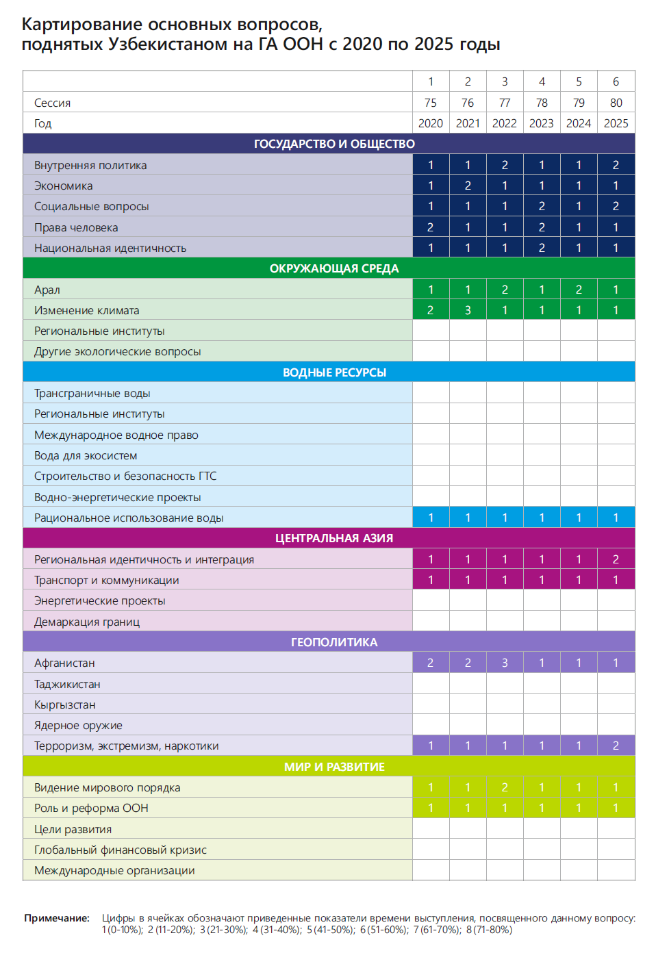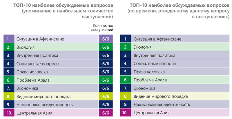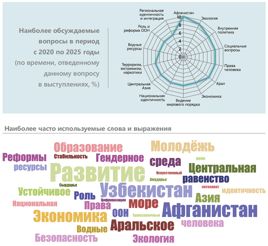 Таким образом, за последние шесть лет Узбекистан демонстрирует активное развитие, выстраивая собственную модель прогресса и формируя приоритеты внутренней и внешней политики. В этот период особую озабоченность страны вызывали вопросы, связанные с прекращением вооружённого конфликта в Афганистане, усилением деятельности террористических и экстремистских группировок, а также ростом производства наркотиков. Среди ключевых проблем, затрагивающих жизненно важные интересы Узбекистана, выделяются создание центральноазиатской зоны сотрудничества, развитие регионального взаимодействия и минимизация последствий Аральской экологической катастрофы. Отдельное внимание уделялось роли ООН в решении региональных и глобальных вопросов и необходимости её реформирования. Наиболее актуальными темами обсуждений оставались «Геополитика», «Окружающая среда» и «Государство и общество».