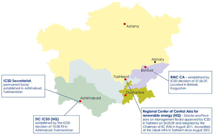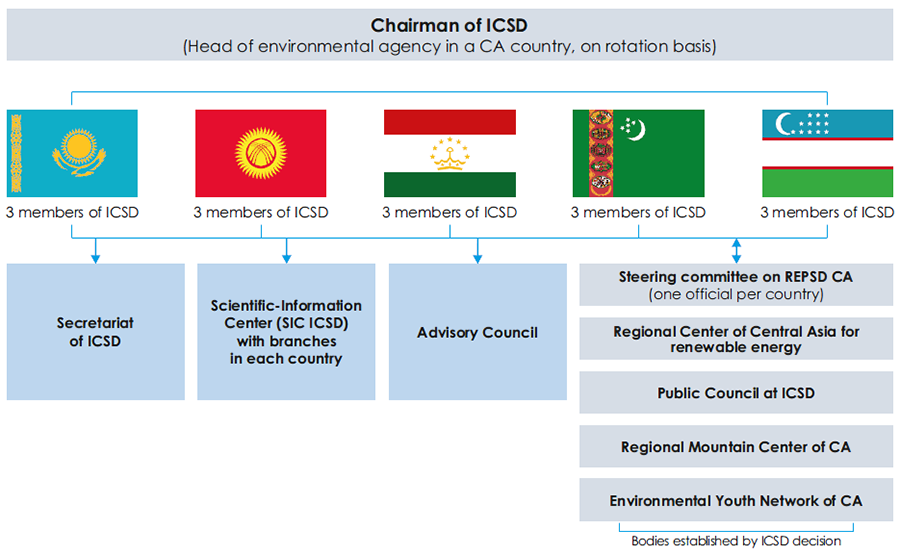 The Interstate Commission on Sustainable Development (ICSD) was established in 1993 by a decision of the Interstate Council for the Aral Sea Basin. It is mandated to coordinate and manage regional cooperation in environmental protection and sustainable development across Central Asian states. The commission’s organizational structure and the locations of its executive bodies are detailed in the figures below.