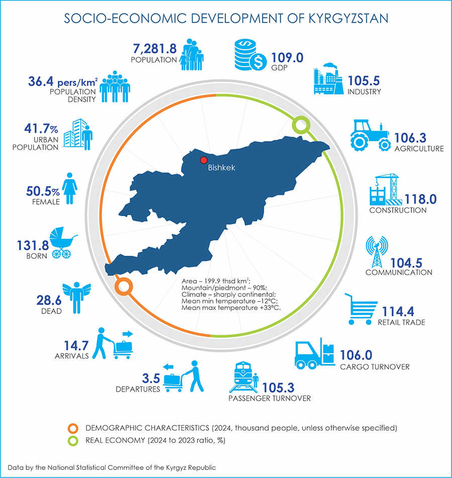 2024 Results. In 2024, GDP reached 17.2 billion KGS, marking a 9% increase compared to 2023. The share of agricultural products in GDP amounted to 9.5%, with a total value of 115.9 billion KGS—reflecting a 6.2% growth. Gross agricultural output totaled 395.6 billion KGS, with a real growth rate of 106.3%. This growth was driven by increased production in both crop farming (up 10.3%) and livestock breeding (up 3.1%). The largest contributions to agricultural output came from crop production (50.9%) and livestock breeding (45.4%). Chuy Province led in agricultural output, accounting for 24.8% of the total production.
