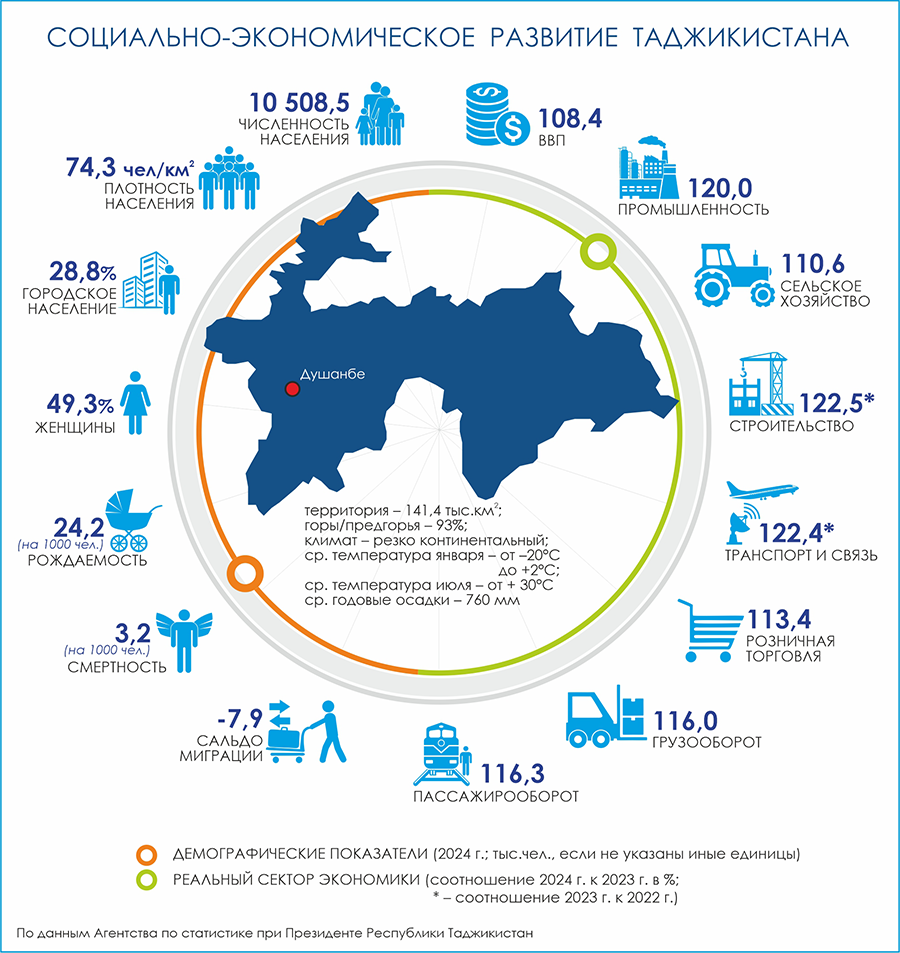 Итоги 2024 г. Доля сельского хозяйства в ВВП страны достигла 24,5%. Общий объем сельскохозяйственного производства составил 73,9 млрд сомони (+10,6 % к 2023 г.). Рост зафиксирован и в растениеводстве – 13,4% (50,9 млрд сомони) и в животноводстве 4,8% (22,9 млрд сомони). Экспортировано 268,3 тыс. тонн сельскохозяйственной продукции на сумму $226,7 млн.