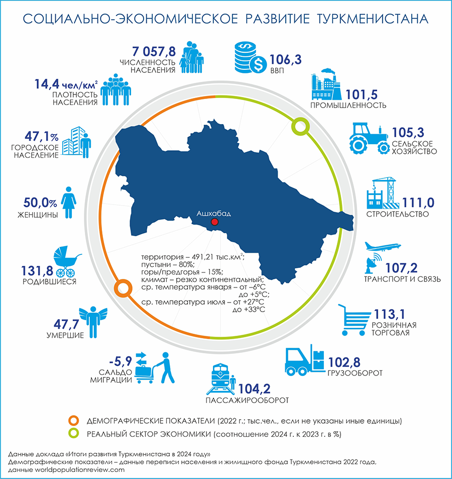 В Ашхабаде проведены: (1) 15-е заседание Совета старейшин ОТГ (12 марта); (2) туркмено-афганский бизнес-форум, на котором АПК был выделен перспективным направлением сотрудничества. Стороны также представили основные принципы и подходы к рациональному управлению водными ресурсами региона (4 марта); (3) заседание Совета глав правительств СНГ, в рамках которого утверждены в т.ч. концепция сотрудничества в сфере энергетики на период до 2035 г. и план первоочередных мероприятий по ее реализации; концепция сотрудничества в области обращения с опасными отходами и ликвидации объектов накопленного вреда окружающей среде и план первоочередных мероприятий на 2024-2029 гг. по ее реализации (24 мая); (4) Инвестиционный форум/TIF 2024, на котором участники обсудили перспективы развития энергетического сектора Туркменистана, включая проекты в области возобновляемой энергетики и устойчивого использования природных ресурсов (10-11 сентября); (5) Международный форум высокого уровня «Взаимосвязь времён и цивилизаций – основа мира и развития», посвящённый 300-летию со дня рождения Махтумкули Фраги. Итоговый документ Форума опубликован на шести официальных языках ООН в качестве официального документа 79-й сессии ГА ООН (11 октября).