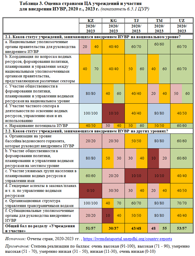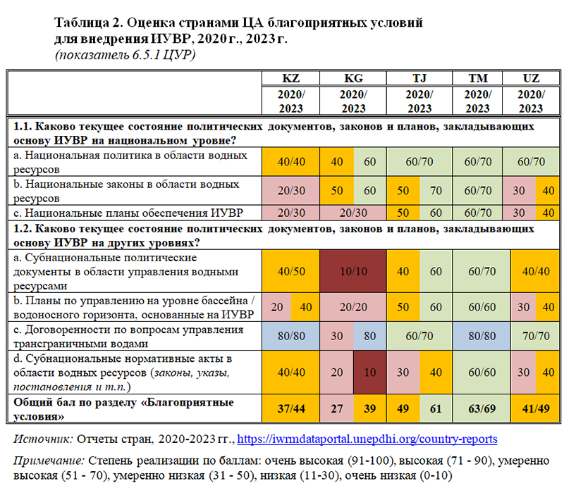К 2023 г. наблюдается положительная динамика практически во всех странах Центральной Азии. Казахстан повысил показатель до 44 баллов, сохранив умеренно низкий уровень. В национальном отчёте страны (таблица 2, показатели 1.1 а, b, c) подчёркивается наличие сохраняющихся проблем, включая недостаточную проработку водного законодательства и стратегического планирования. Кыргызстан, несмотря на рост до 39 баллов, что позволило перейти из категории низкий (27 баллов) в умеренно низкий (39 баллов) уровень, продолжает испытывать трудности с внедрением политических документов на национальном и других уровнях (таблица 2, показатели 1.1 и 1.2). Таджикистан улучшил результат до 61 балла, перейдя в категорию умеренно высокий уровень; Туркменистан увеличил показатель до 69 баллов, сохранив позицию в категории умеренно высокий уровень; Узбекистан повысил оценку до 49 баллов, сохранив умеренно низкий уровень. При этом договоренности по вопросам управления трансграничными водами (таблица 2, показатель 1.2c) получили высокие или умеренно высокие оценки во всех странах. Казахстан, Кыргызстан и Туркменистан оценили наличие таких соглашений максимально — в 80 баллов, Узбекистан и Таджикистан — 70.
