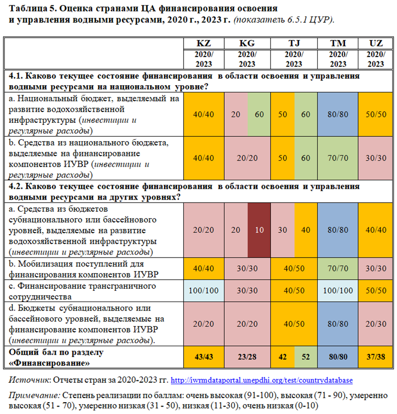 Указанная динамика свидетельствует о продолжающемся дефиците устойчивых и эффективных финансовых механизмов в сфере ИУВР. В большинстве стран региона отмечаются ограниченные объемы национального финансирования, высокая зависимость от международных доноров, а также отсутствие достаточных экономических стимулов к рациональному водопользованию. Так, в Кыргызской Республике национальные ресурсы покрывают лишь базовые потребности водного сектора (таблица 5, показатель 4.1а), что сказалось на увеличении показателя с 20 до 60 баллов за период отчетности. Инвестиции же в мероприятия по ИУВР (таблица 5, показатель 4.1b) остаются крайне ограниченными (20 баллов), что усиливает потребность в международной поддержке. Аналогичная ситуация прослеживается и в Узбекистане (таблица 5, показатели 4.1а и 4.1 b) – ситуация с 2020 г. осталась неизменной.