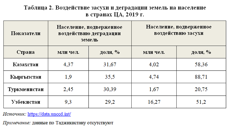 Воздействию деградации земель подвергаются 18,01 млн человек (30,5% населения региона), а засухам - 26,7 млн человек (51,3%). В разрезе стран, доля населения, затрагиваемого деградацией земель, колеблется от 29,2% в Узбекистане (9,3 млн) до 35,5% в Кыргызстане (1,9 млн). В свою очередь, доля населения, испытывающего влияние засух, варьирует от 20,75% в Туркменистане (1,67 млн) до 88,71% в Кыргызстане (4,74 млн человек) (таблица 2).
