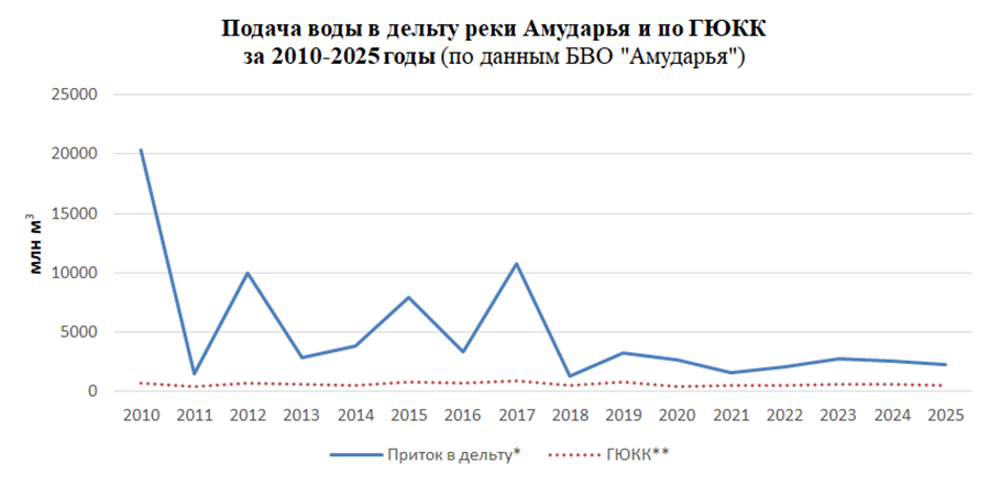 По данным БВО «Амударья», в 2025 г. в дельту р.Амударья поступило 2291 млн м3 воды (включая речной сток, сбросы из каналов и коллекторов), что на 297 млн м3 меньше, чем в 2024 г., и на 419 млн м3 меньше, чем в 2023 г.