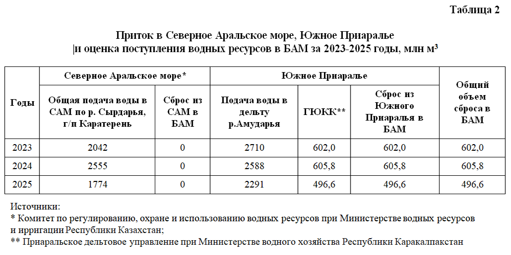 В 2025 г. вода в сторону БАМ поступала только по ГЮКК (496,6 млн м3). Из дельты р.Амударья и Северного Аральского моря (САМ) вода в БАМ не поступала (табл. 2).