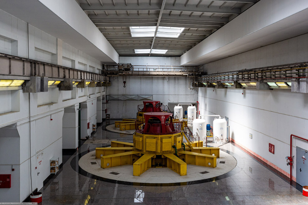 Фотография сделана с крыши машинного зала. Слева видны сталежелезобетонные турбинные водоводы. Слева двухниточные открытые водоводы длиной 190 м и диаметром 5 м каждый. Справа площадка для строительства еще двух ниток второй очереди. Сверху, на площадке смонтирована развилка на две нитки, открытая часть водовода длиной 32 метра и однониточный подземный водовод длиной 230 метров. Далее уже идет деривационный тоннель длиной 5213 м и диаметром 7,5 м, пропускной способностью 270 м3/с.