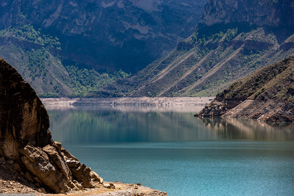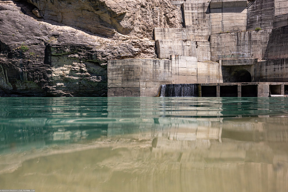 Эксплуатационный водосброс Ирганайской ГЭС. После зимы вода спущена. В Дагестане водохранилища набирают воду весной за счет таяния снега и летом, в основном, за счет осадков . А зимой срабатывают накопленную воду.