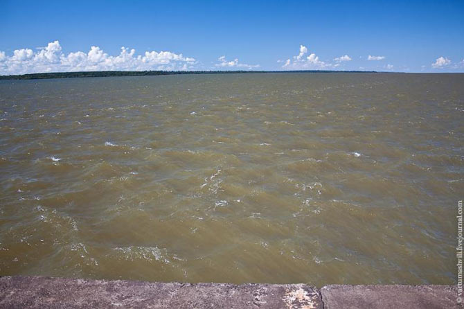 Через несколько километров вода возвращается к своему обычному неспешному течению реки... На левом берегу Бразилия, а на правом — уже Парагвай.