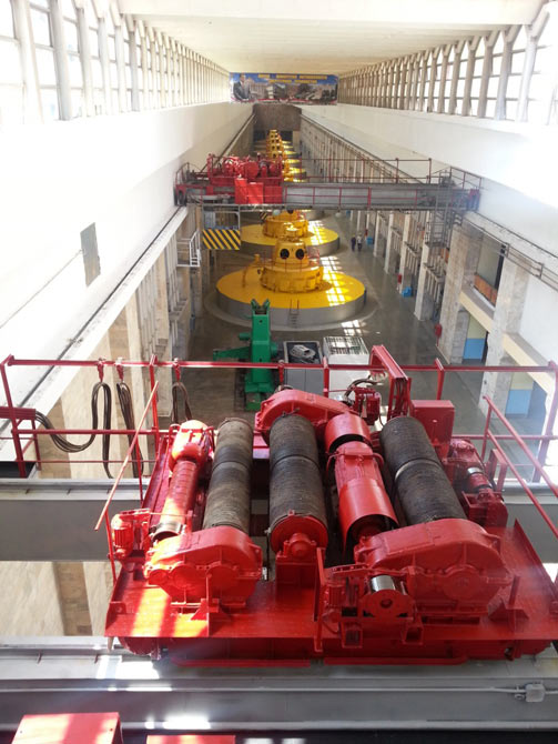 Макет всего комплекса гидроузла в помещении, где расположен пульт управления. Вода к агрегатам подаётся по трём подводящим напорным туннелям длиной от 395 до 450 метров и диаметром 10 метров. Эти туннели заканчиваются коллекторами, от которых отходят по три напорных водовода диаметром 6 метров каждый и длиной от 610 до 666 метров.