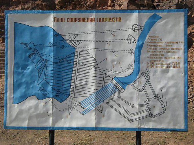Вид на плотину со смотровой площадки. Высота плотины составляет 300 метра, что делает её самой высокой плотиной в мире. Площадь зеркала водохранилища 98 квадратных километров, объём - 10,5 кубических километров, длина - около 70 км.