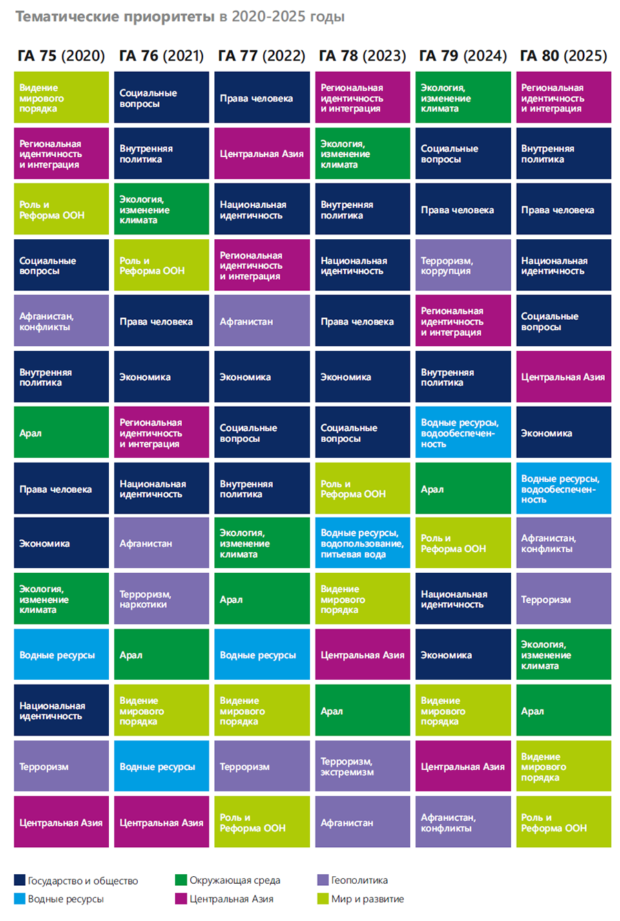 Таким образом, за последние шесть лет Узбекистан демонстрирует активное развитие, выстраивая собственную модель прогресса и формируя приоритеты внутренней и внешней политики. В этот период особую озабоченность страны вызывали вопросы, связанные с прекращением вооружённого конфликта в Афганистане, усилением деятельности террористических и экстремистских группировок, а также ростом производства наркотиков. Среди ключевых проблем, затрагивающих жизненно важные интересы Узбекистана, выделяются создание центральноазиатской зоны сотрудничества, развитие регионального взаимодействия и минимизация последствий Аральской экологической катастрофы. Отдельное внимание уделялось роли ООН в решении региональных и глобальных вопросов и необходимости её реформирования. Наиболее актуальными темами обсуждений оставались «Геополитика», «Окружающая среда» и «Государство и общество».