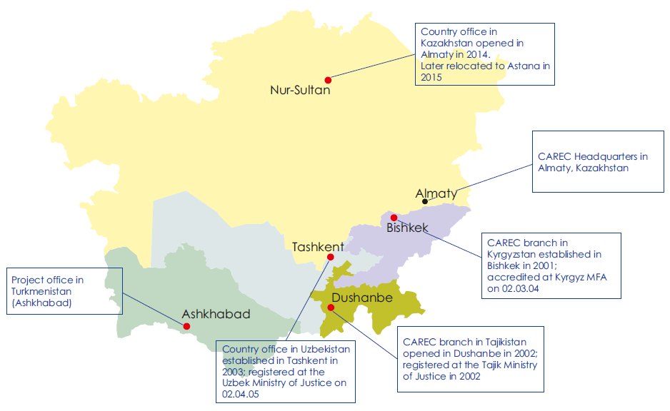 CAREC is an independent, non-profit, nonpolitical international organization, which assists the Central Asian governments, regional and international stakeholders and partners in addressing their environmental and sustainable development issues in Central Asia. The headquarters is located in Almaty, with the country offices operational in 5 Central Asian states.