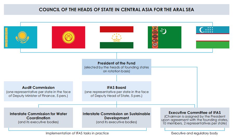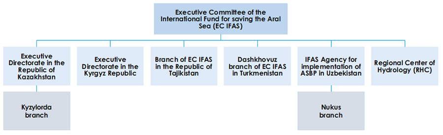 The International Fund for Saving the Aral Sea (IFAS) was established by the decision of the Heads of the Central Asian states on the 4th January of 1993 with the aim of developing and funding the environmental and applied research projects and programs in order to improve the ecological situation in the areas affected by the Aral Sea catastrophe and to address the socio-economic issues in this region. The organizational setup of IFAS is depicted in the diagram below.