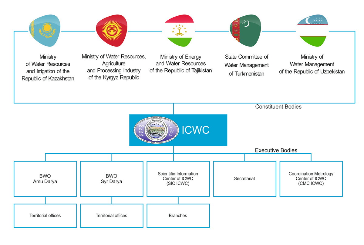 Established on February 18, 1992, the Interstate Commission for Water Coordination in Central Asia (ICWC) is a regional body dedicated to the management, sustainable use, and protection of transboundary water resources in the Aral Sea basin. The Commission operates on the principles of cooperation and mutual respect, implementing joint programs that balance the interests of all member states. The organizational set-up of ICWC is shown in the diagram below.
