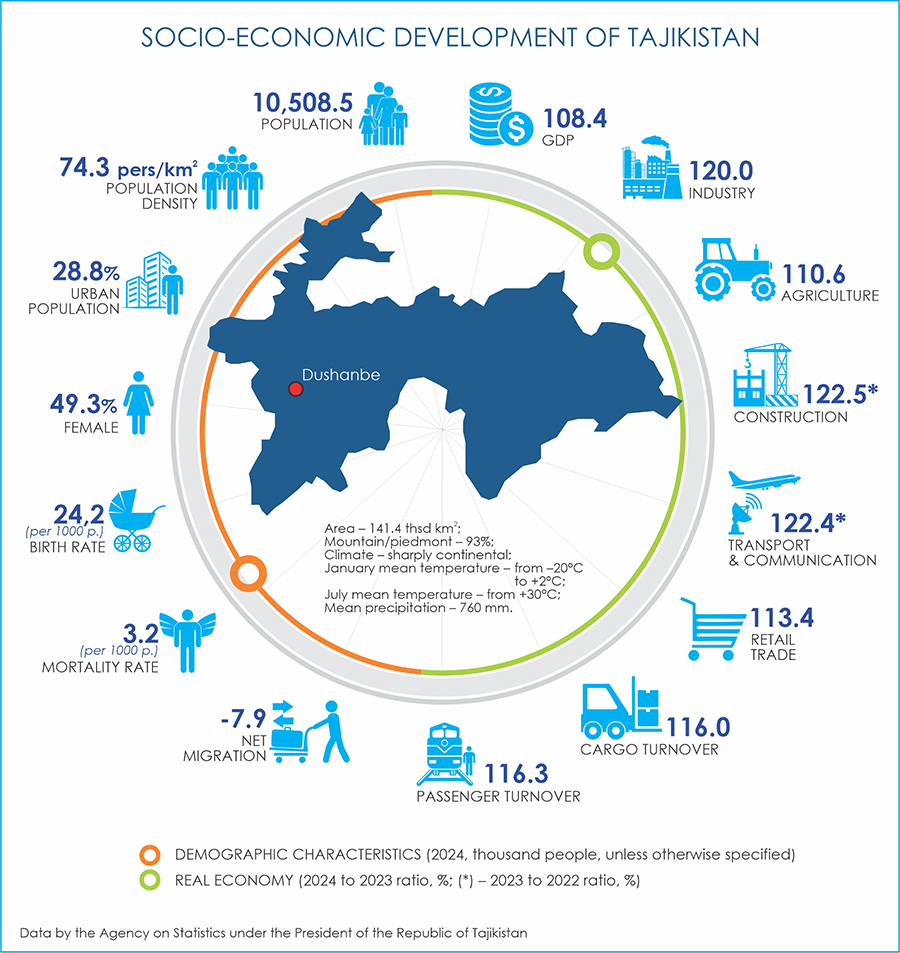 2024 results Agriculture accounts for 24.5% of Tajikistan's GDP. In 2024, total agricultural output reached 73.9 billion TJS, marking a 10.6% increase as compared to 2023. This growth was driven by a 13.4% rise in crop production (50.9 billion TJS) and a 4.8% increase in animal husbandry (22.9 billion TJS). Agricultural exports totaled 268.3 thousand tons, valued at $226.7