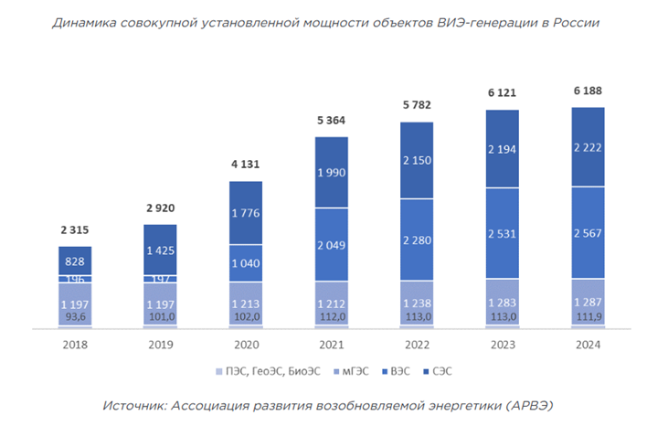 За последние пять лет установленная мощность объектов ВИЭ удвоилась и к июню 2024 г. достигла 6,16 ГВт: 2,6 ГВт обеспечивают 26 ветропарков; 2,2 ГВт – 70 СЭС, 1,3 ГВт – девять малых ГЭС, а более 100 МВт приходится на биомассу, биогаз, свалочный газ и геотермальную энергетику. Тем не менее, доля «зеленой» энергетики в энергопотреблении страны пока составляет лишь 1,12%. Крупнейшие проекты реализовали «Лукойл» (ветропарки на Севере), «Росатом» (ветропарки на Юге) и «Русгидро» (каскады малых ГЭС).