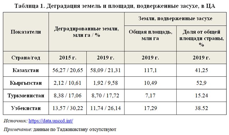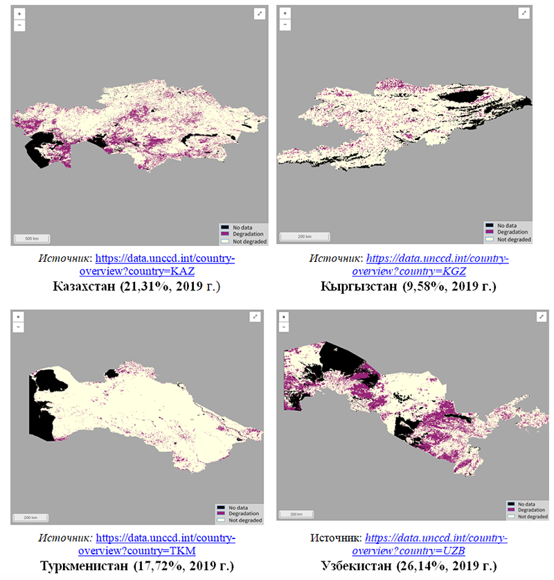 Центральная Азия – регион, где сочетание суровых природных условий и высокой антропогенной нагрузки делает проблему деградации земель особенно актуальной. Ландшафт здесь изначально уязвим: значительные площади занимают пустынные и полупустынные территории — Кызылкум, Каракум, плато Устюрт, а также новая пустыня Аралкум, сформировавшаяся на месте высохшего Аральского моря. К ключевым факторам деградации относятся чрезмерный выпас скота, неэффективное земле- и водопользование, разрушение лесных и кустарниковых экосистем, изменение климата (UNCCD, 2023). По оценкам ООН, по состоянию на 2019 г. более 20% земель региона (около 80 млн га) уже подверглись деградации, что почти в четыре раза превышает площадь Кыргызстана (таблица 1, рис.5).