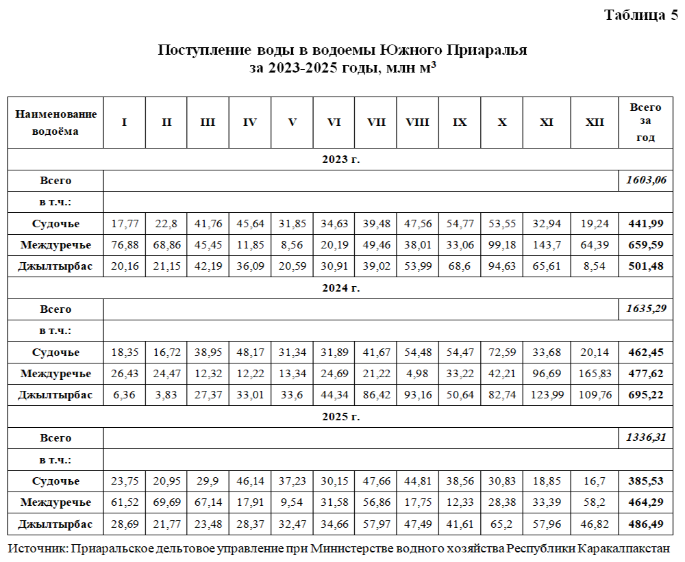 Поступление коллекторно-дренажных вод в 2025 г. в локальные водоемы Южного Приаралья (табл. 5) уменьшилось по сравнению с 2024 г. с 1635,29 до 1336,31 млн м3, что также связано с уменьшением водоподачи в дельту р.Амударья.