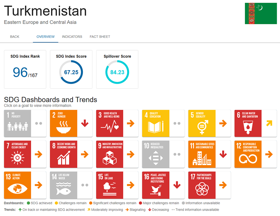 Правительство Туркменистана и отделение ООН в Туркменистане провели в Ашхабаде серию рабочих встреч по укреплению системы отчетности по ЦУР, включая вопросы данных в сельском хозяйстве, продовольственной безопасности, прав на землю, устойчивого потребления и производства, а также охраны окружающей среды (21-24 апреля, Туркменистан). В ежегодном рейтинге устойчивого развития, публикуемого ООН и Фондом Bertelsmann, Туркменистан занял 96 место среди 167 стран.