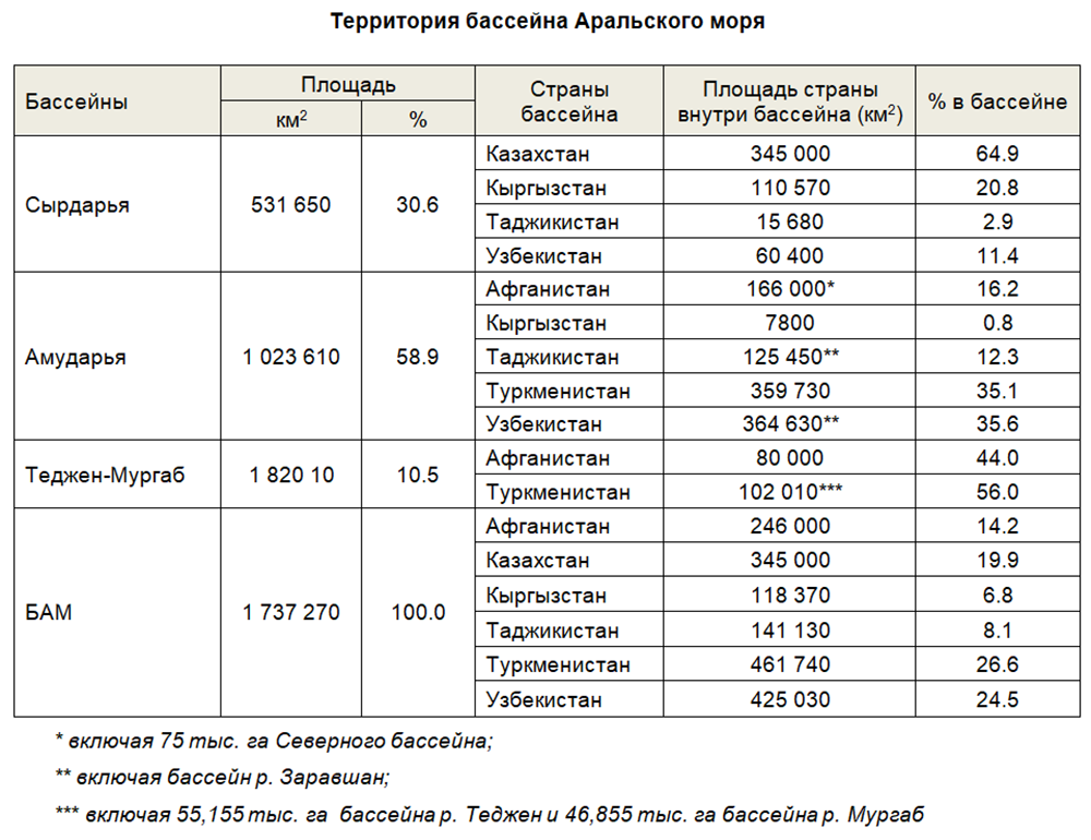 Источник: Соколов В.И. Определение границ водосборных бассейнов трансграничных, местных и смешанного типа поверхностных водных ресурсов в бассейне Аральского моря и их количественная оценка // Разработка основных компонентов политики МКВК в вопросах рационального водопользования и охраны водных ресурсов в бассейне Аральского моря (Сборник научных трудов НИЦ МКВК, вып. 2, 2000)