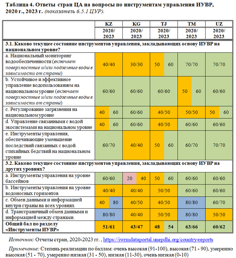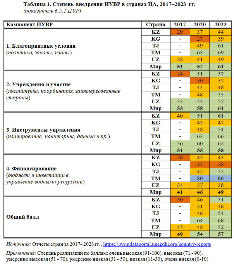 К 2023 г. наблюдается положительная динамика практически во всех странах Центральной Азии. Казахстан повысил показатель до 44 баллов, сохранив умеренно низкий уровень. В национальном отчёте страны (таблица 2, показатели 1.1 а, b, c) подчёркивается наличие сохраняющихся проблем, включая недостаточную проработку водного законодательства и стратегического планирования. Кыргызстан, несмотря на рост до 39 баллов, что позволило перейти из категории низкий (27 баллов) в умеренно низкий (39 баллов) уровень, продолжает испытывать трудности с внедрением политических документов на национальном и других уровнях (таблица 2, показатели 1.1 и 1.2). Таджикистан улучшил результат до 61 балла, перейдя в категорию умеренно высокий уровень; Туркменистан увеличил показатель до 69 баллов, сохранив позицию в категории умеренно высокий уровень; Узбекистан повысил оценку до 49 баллов, сохранив умеренно низкий уровень. При этом договоренности по вопросам управления трансграничными водами (таблица 2, показатель 1.2c) получили высокие или умеренно высокие оценки во всех странах. Казахстан, Кыргызстан и Туркменистан оценили наличие таких соглашений максимально — в 80 баллов, Узбекистан и Таджикистан — 70.