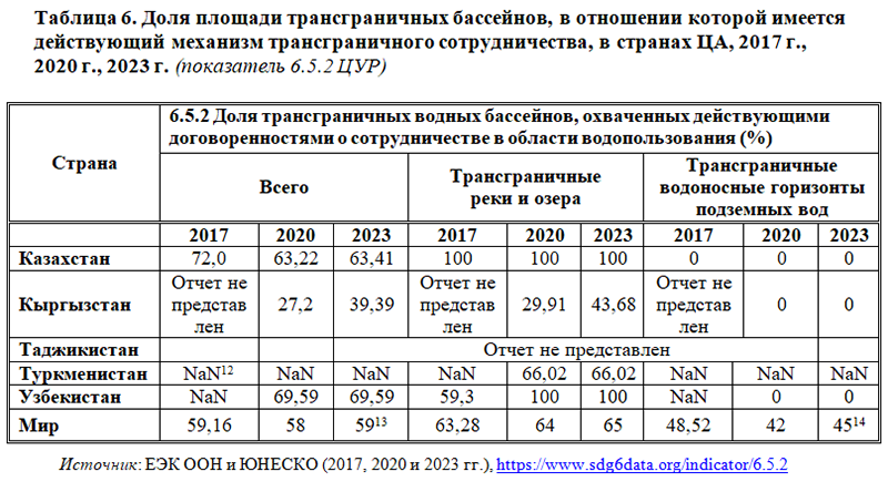 Ситуация с трансграничным водным сотрудничеством в странах Центральной Азии характеризуется высокой степенью неоднородности: 100% площади бассейнов трансграничных рек и озер в Казахстане и Узбекистане, 66,2% - в Туркменистане и 43,68% - в Кыргызстане охвачены действующими механизмами сотрудничества (таблица 6).