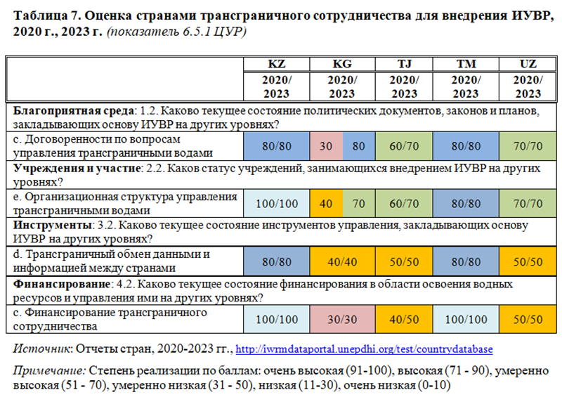 Указанные результаты согласуются с результатами по показателю 6.5.1 ЦУР (таблица 7). Как отмечалось ранее, в 2023 г. договоренности по вопросам управления трансграничными водами (показатель 1.2.с.) и организационная структура управления трансграничными водами (показатель 2.2е) получили высокие и очень высокие оценки от всех стран региона. При этом Кыргызстан и Таджикистан к 2023 г. улучшили свои значения. Значения по трансграничному обмену данными и информацией между странами (показатель 3.2d) остались без изменений: в Казахстане и Туркменистане они оцениваются как высокие, что свидетельствует о развитой инфраструктуре и эффективных механизмах взаимодействия. В остальных странах, этот показатель сохраняется на уровне умеренно низкого, что указывает на необходимость дальнейшего совершенствования координации и интеграции информационных систем.
